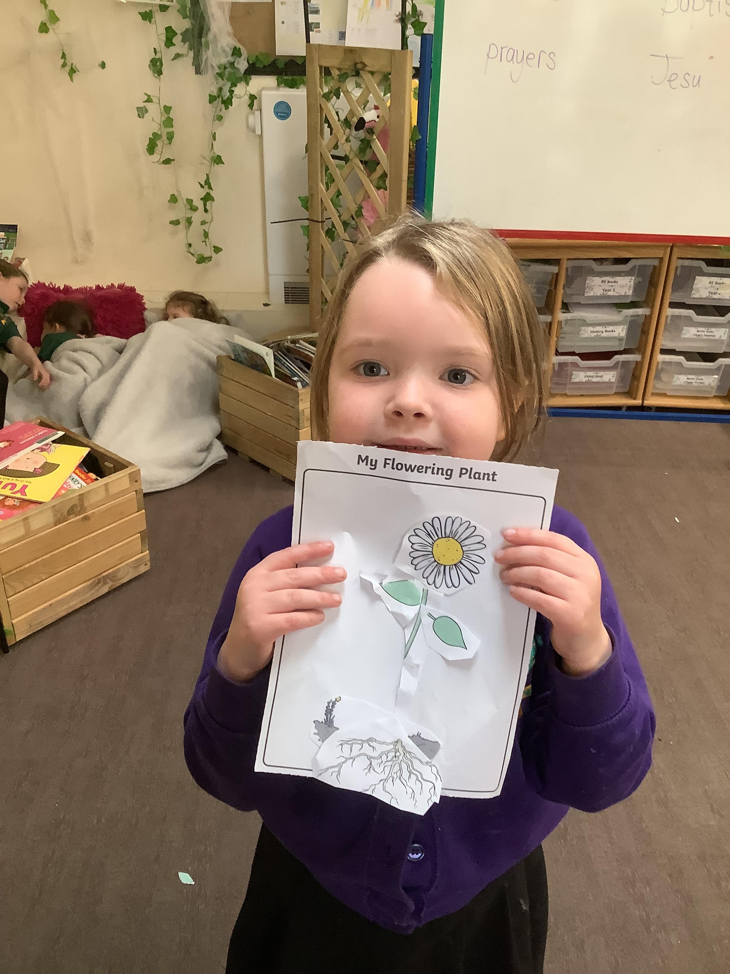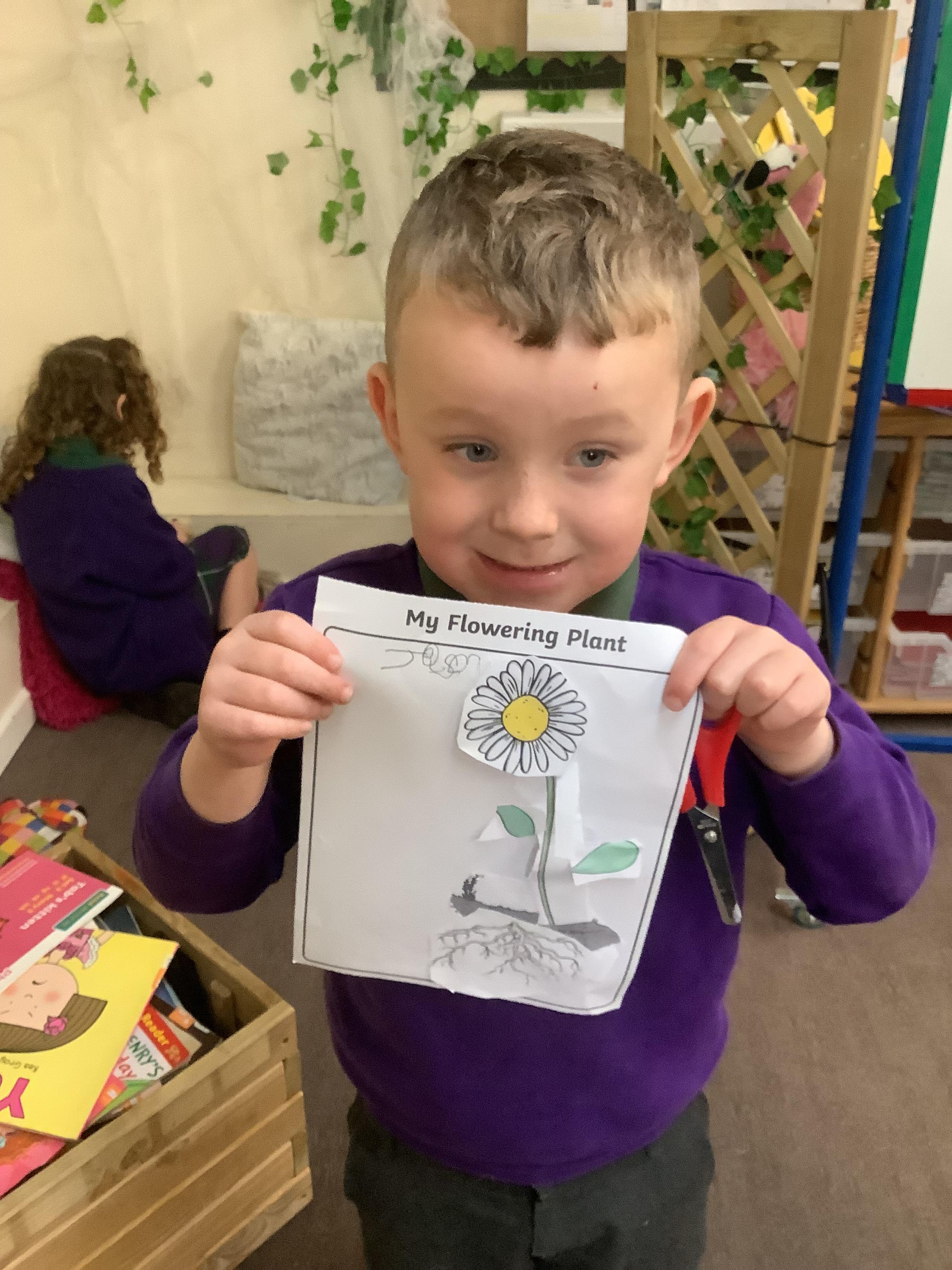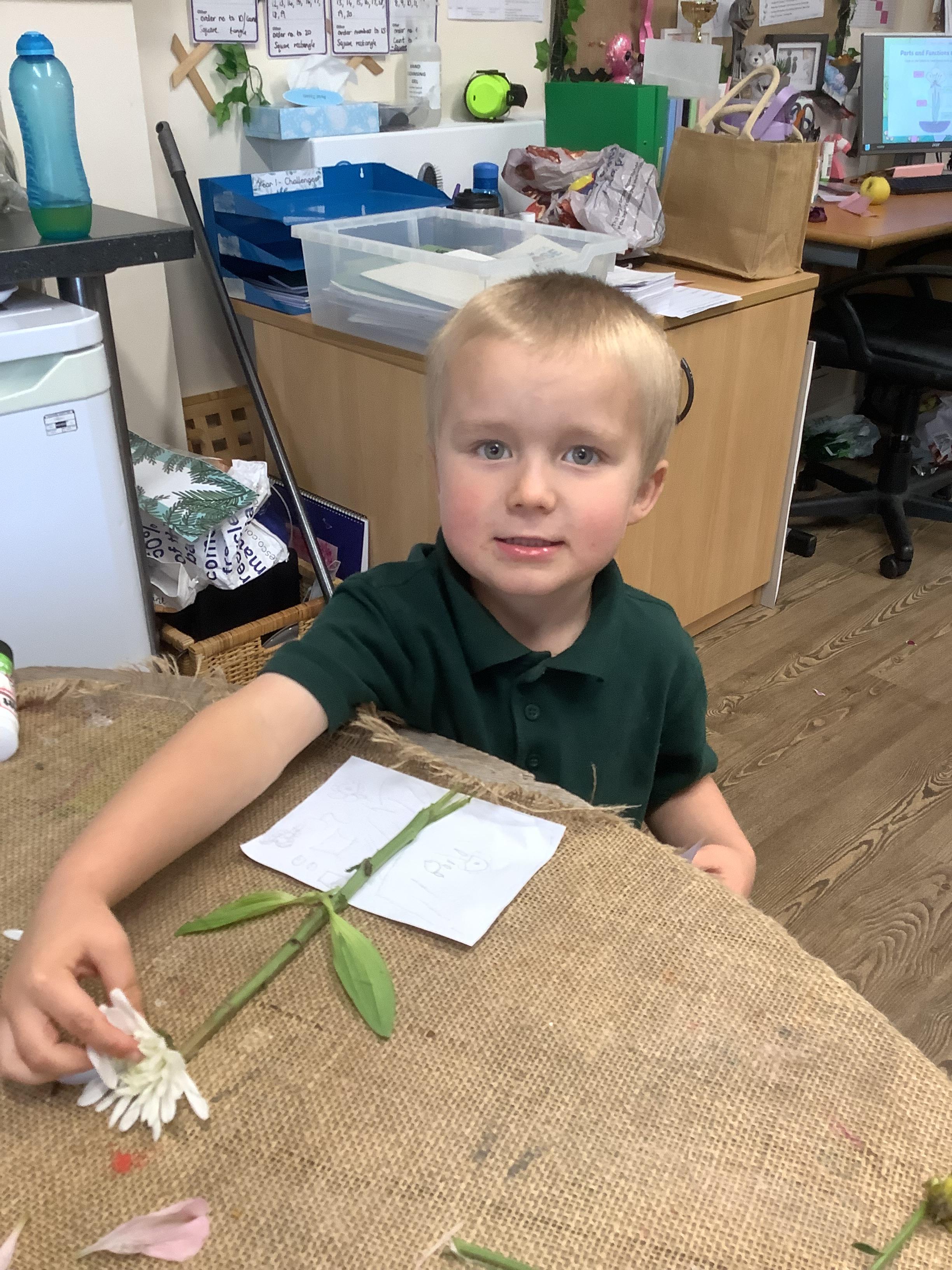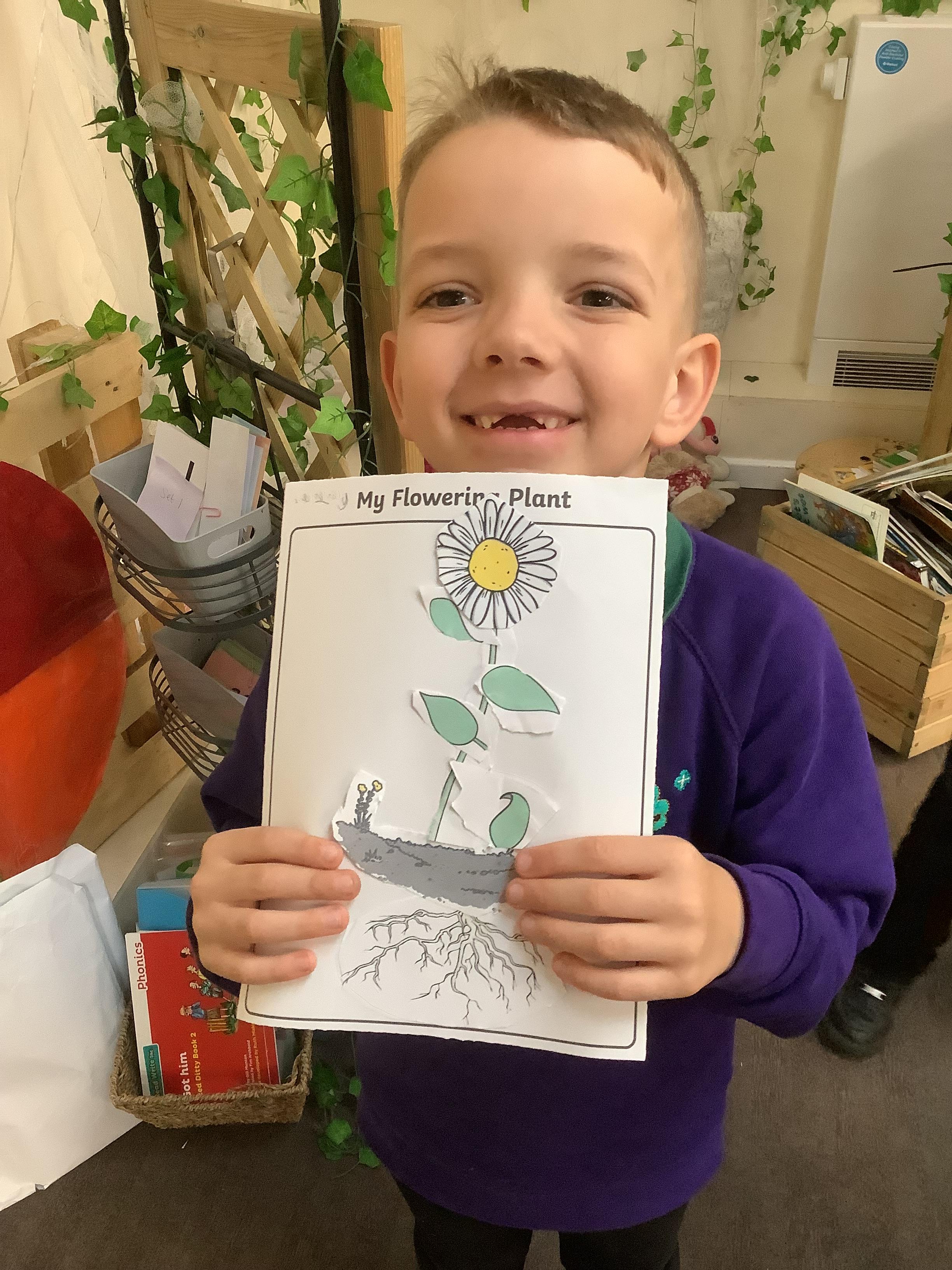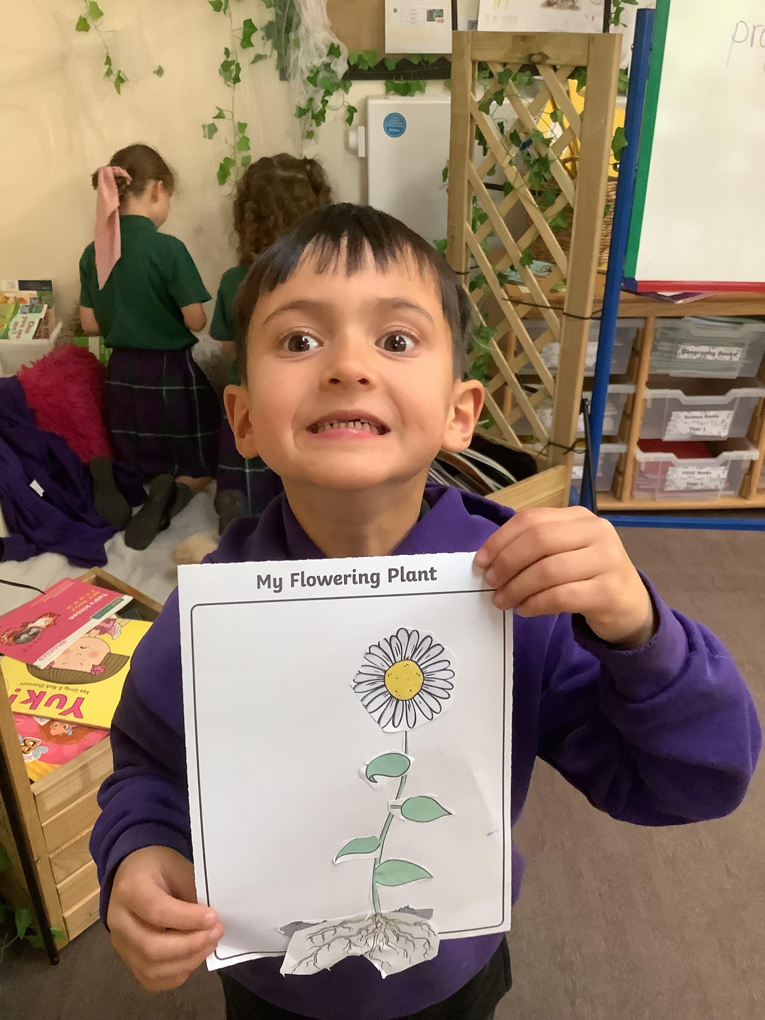 The children have been learning about plants. They used different flowers to create their own plant. Using post it notes the children then had to label and describe the different parts and functions of a plant.