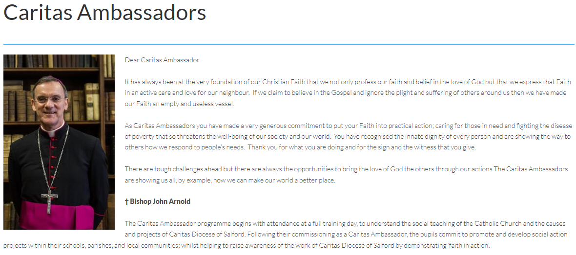 Our Caritas Ambassadors put their faith into practical action. They are responsible for developing outreach work and supporting local charities. They will be a voice for change and social action. Caritas Ambassadors bring the love of God to others through their actions. Caritas Ambassadors are showing us all, by example, how we can make our world a better place. We are proud of our Caritas Ambassadors and their mission in school and the local community.