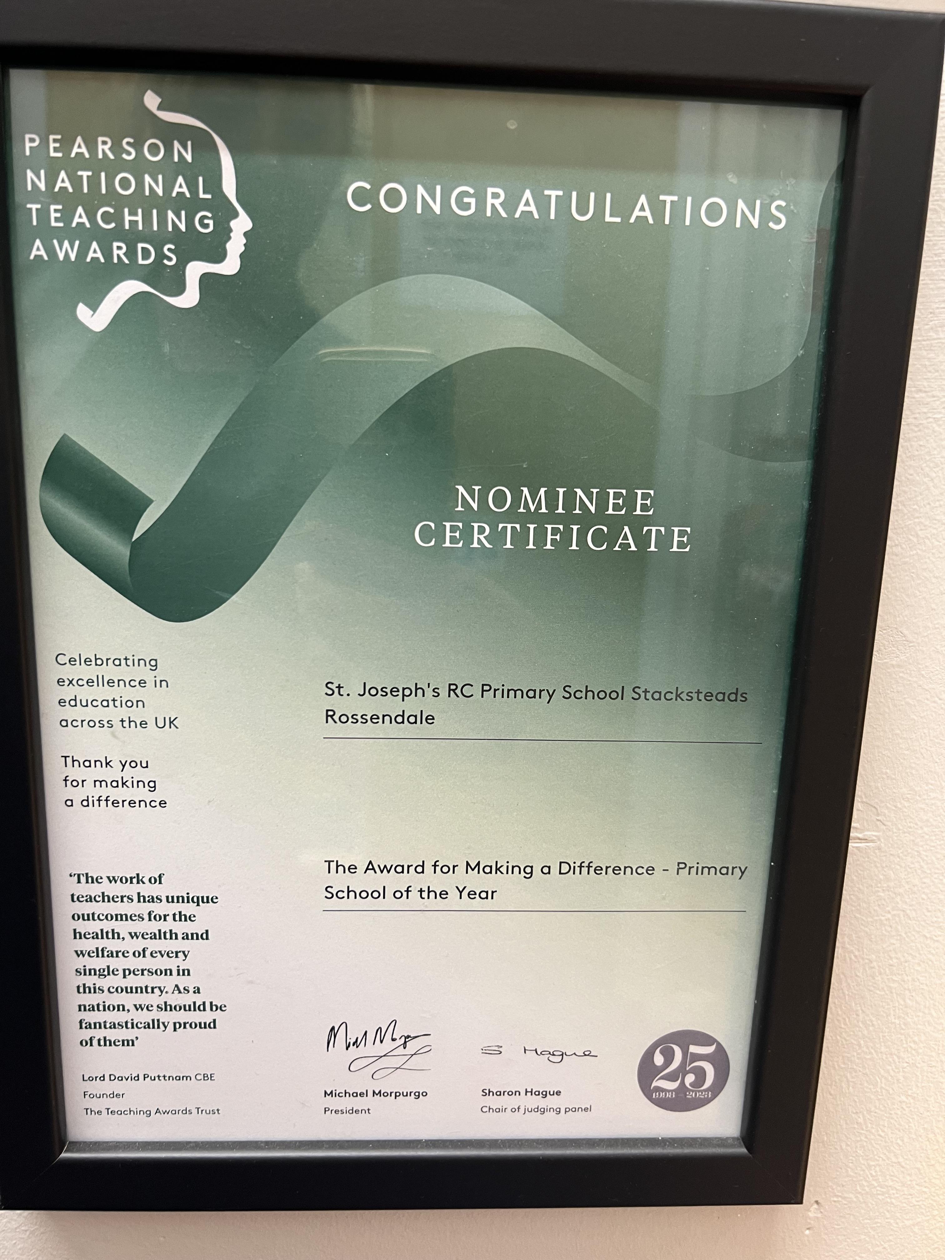 St Joseph's is a thriving Catholic primary school set in the village of Stacksteads, close to the town of Bacup in the Rossendale Valley. We are a Voluntary Aided school, welcoming children from 3 to 11 years of age, regardless of their faith or cultural background.