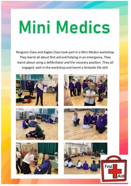 Penguins Class and Eagles Class took part in a Mini Medics workshop. They learnt all about first aid and helping in an emergency. They learnt about using a defibrillator and the recovery position. They all engaged well in the workshop and learn